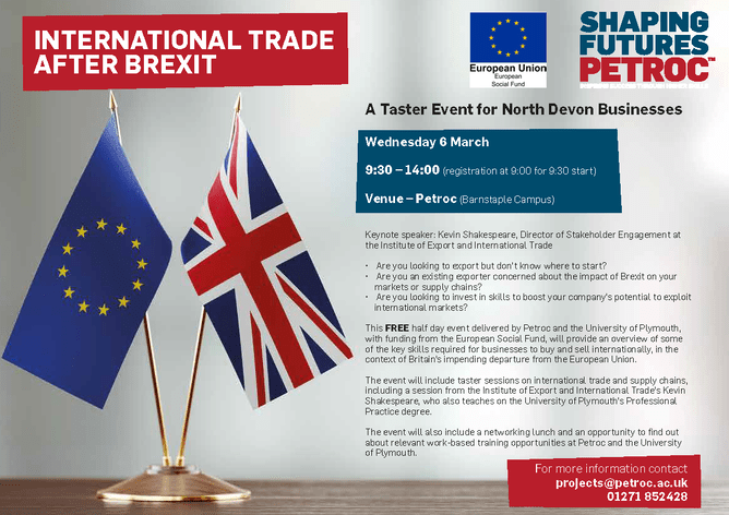 Confused about how Brexit will affect export for your business? Petroc have a free event in association with Plymouth University to help answer your questions.